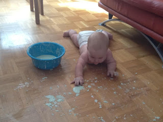 As soon as he was sitting with support I started introducing him to lots of messy play. I make sure that all the materials I use at the moment are edible so there is no worry when he puts things in his mouth., which of course he will do because babies use their mouths to explore and investigate new objects!
