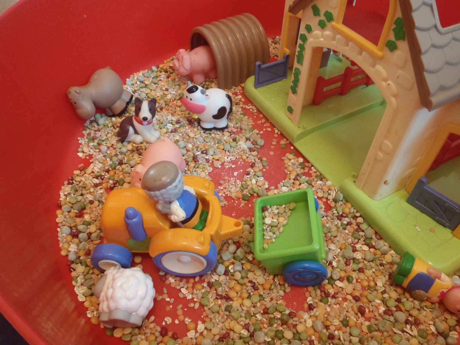 I then set up Hartley's farm set. I added some lentils for an extra sensory element.